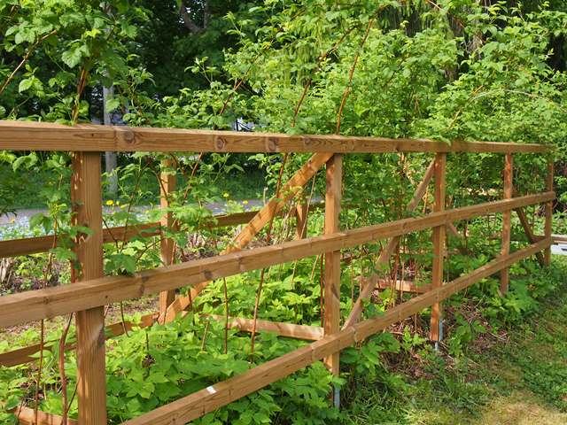 Meillähän on sellainen 11 metriä pitkä vadelmapusikko pihan perällä (kyllä, 11 metriä, se on nyt mitattu). Ei taida blogista löytyä kuvia siitä alkuperäisessä asussaan, mutta penkki oli aidattu maalatuista puutolpista ja paneelilaudoista kyhätyllä rakennelmalla, joka oli vinotuista huolimatta vinossa, vinotuet häiritsivät ruohonleikkuuta ja osa tolpista olivat jo täysin lahot. Samoin kehikko oli niin matala, että yli parimetrisiksikin venyvät versot kaatuilivat toistensa päälle ja maahan niin että osa marjoista väistämättä homehtuu aina puskaan, ja kerääminenkin on vaivalloista kykkimistä. Päätimme siis että täytyy tehdä jotain.